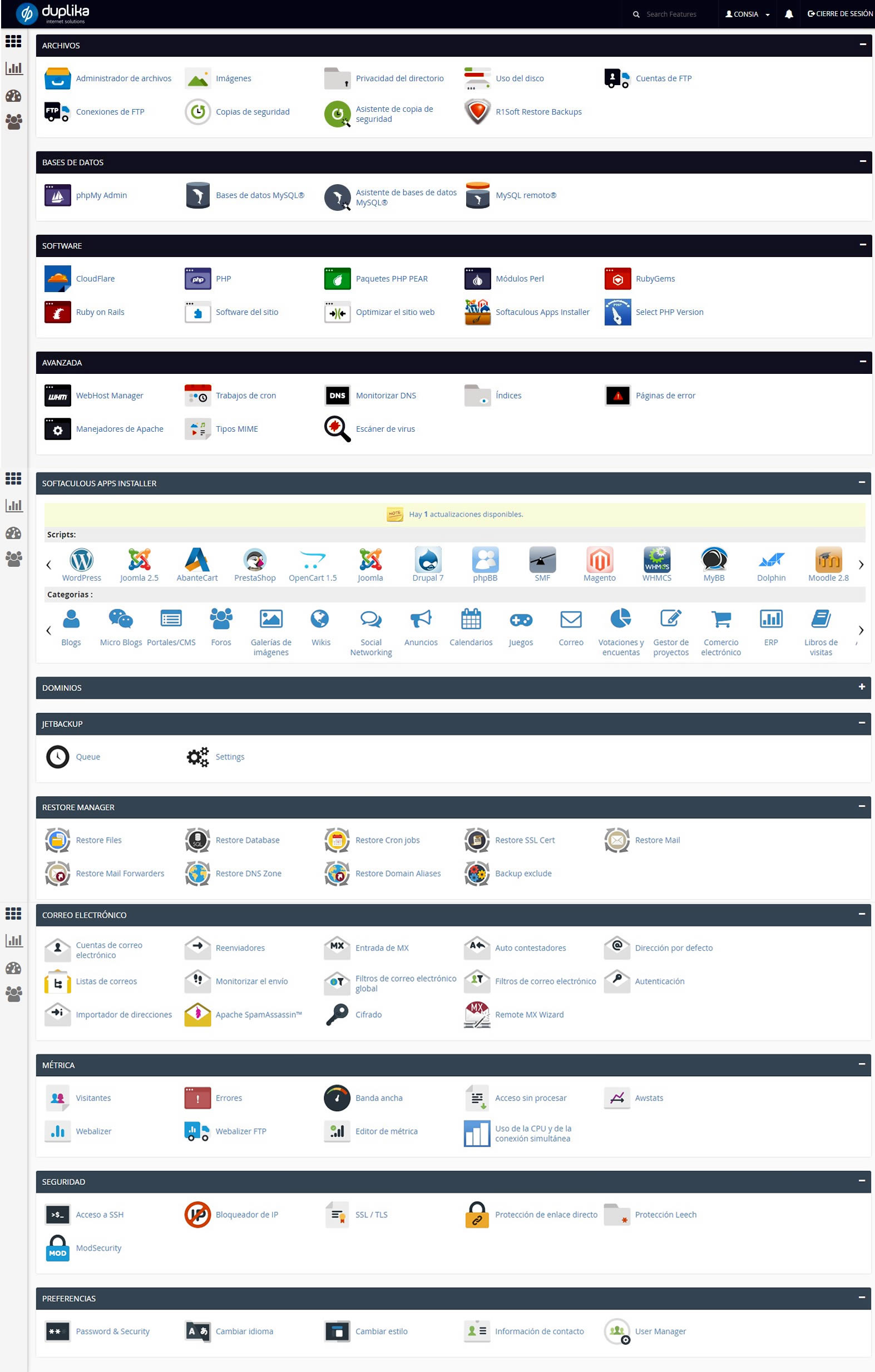 Mediante el acceso al Panel de Control usted podrá administrar las siguientes funcionalidades: